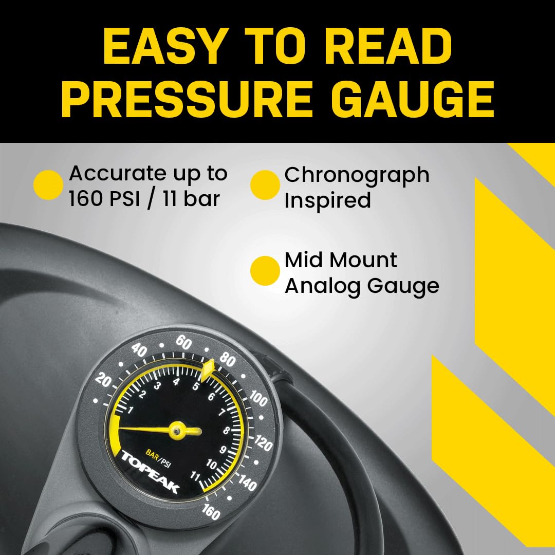 - Precision 160 PSI Gauge – Large, easy-to-read analog pressure gauge provides accurate inflation control for road, mountain, and hybrid bike tires.